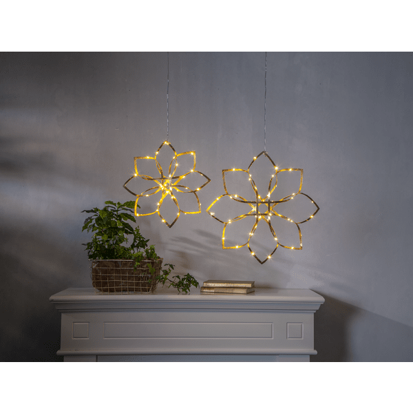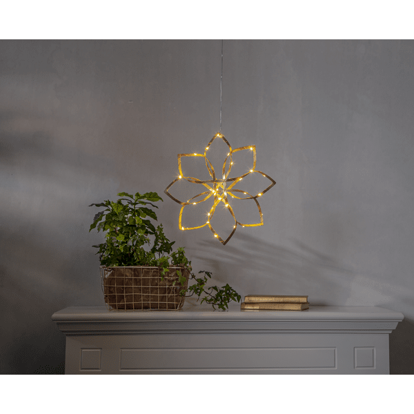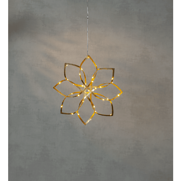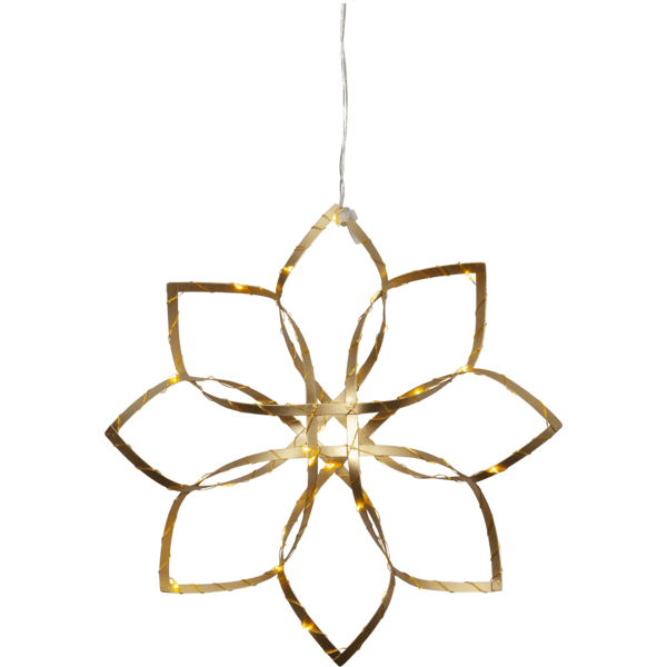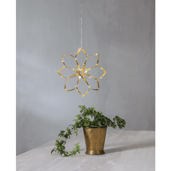 Wunderschöner Stern in messingfarbenem Metallband für den Innenbereich. Der Stern verfügt über 36 LEDs mit warmweißem Licht. Eine hübsche Dekoration zum Aufhängen am Fenster oder an der Wand während der Advents- und Weihnachtszeit. Inklusive 3,5 m langem, transparentem Kabel und Transformator.