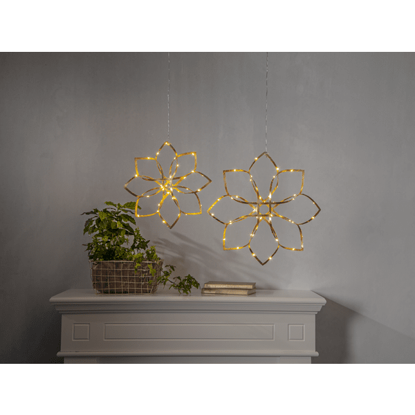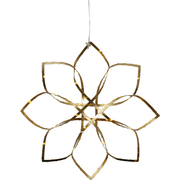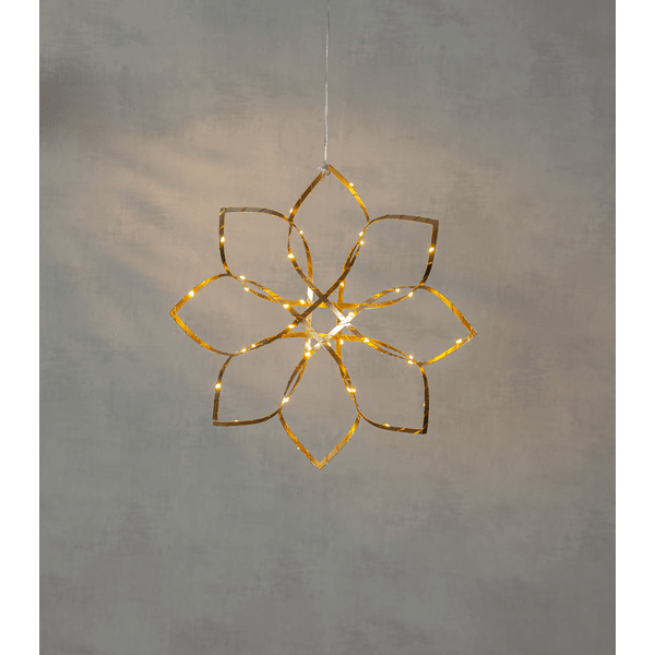 Wunderschöner Stern in messingfarbenem Metallband für den Innenbereich. Der Stern verfügt über 48 LEDs mit warmweißem Licht. Eine hübsche Dekoration zum Aufhängen am Fenster oder an der Wand in der Advents- und Weihnachtszeit. Inklusive 3,5 m langem, transparentem Kabel und Transformator.