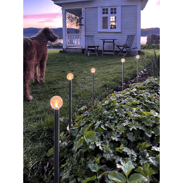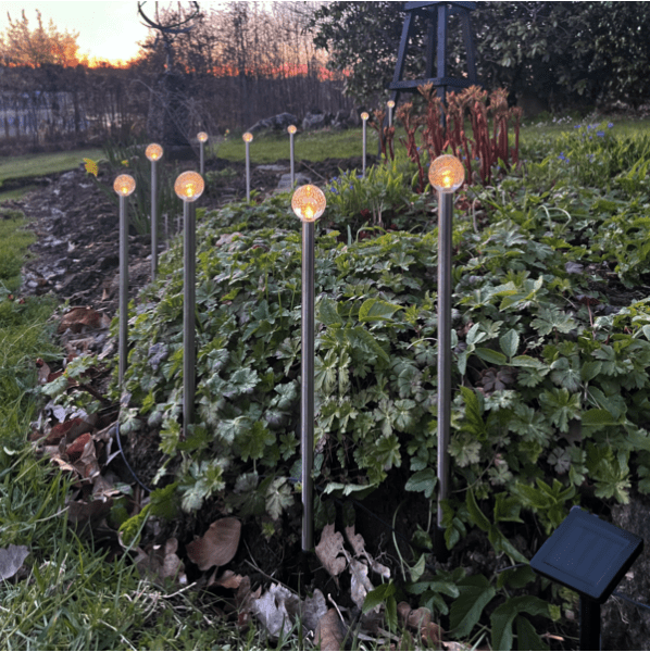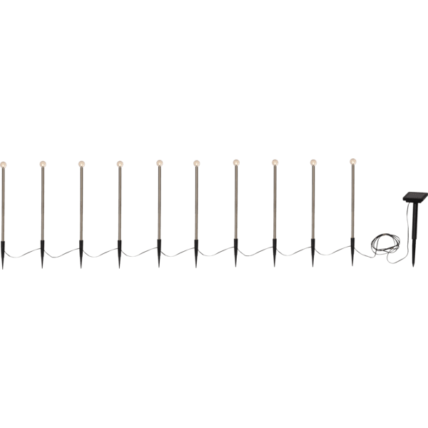 Bubbly 10-Pin ist eine wunderschöne solarbetriebene Dekoration, die im Dunkeln leuchtet. Diese Solarbeleuchtung besteht aus 10 Stäben mit einer HöheMehr lesenBubbly 10-Pin ist eine wunderschöne solarbetriebene Dekoration, die im Dunkeln leuchtet. Diese Solarbeleuchtung besteht aus 10 Stäben mit einer Höhe von ca. 30 cm und einer Seifenblasenkugel an der Spitze, die in warmweißem Licht leuchtet. Die 10 Solarzellenstäbe sind im Abstand von 30 cm miteinander verbunden und die Gesamtlänge beträgt ca. 270 cm. Diese Solarzellen-Dekoration eignet sich hervorragend zum Dekorieren im Garten oder auf der Veranda. ein Balkon. Der Panelteil selbst verfügt über ein 200 cm langes grünes Anschlusskabel, sodass er problemlos in die Sonne gelegt werden kann, um den mitgelieferten Akku aufzuladen. Brenndauer ca. 6 Stunden.