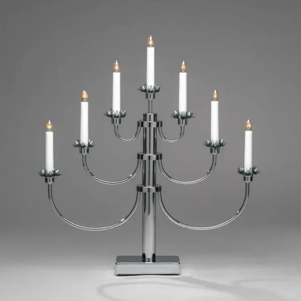 Schaffen Sie mit diesem prächtigen Adventskerzenhalter aus Chrom ein stimmungsvolles und elegantes Weihnachtsfest. Das klassische Design mit seinen sieben LichternMehr lesenSchaffen Sie mit diesem prächtigen Adventskerzenhalter aus Chrom ein stimmungsvolles und elegantes Weihnachtsfest. Das klassische Design mit seinen sieben Lichtern und dekorativen Details vermittelt ein zeitloses und luxuriöses Gefühl. Perfekt, um während der gesamten Adventszeit ein warmes Licht zu verbreiten und eine einladende Atmosphäre im Haus zu schaffen. Eine wahre Weihnachtsikone, die nie aus der Mode kommt! Lieferung mit 2,4 m weißem Kabel, Netzschalter und Stecker. Inklusive 7 auswechselbaren E10-Glühbirnen (24V).