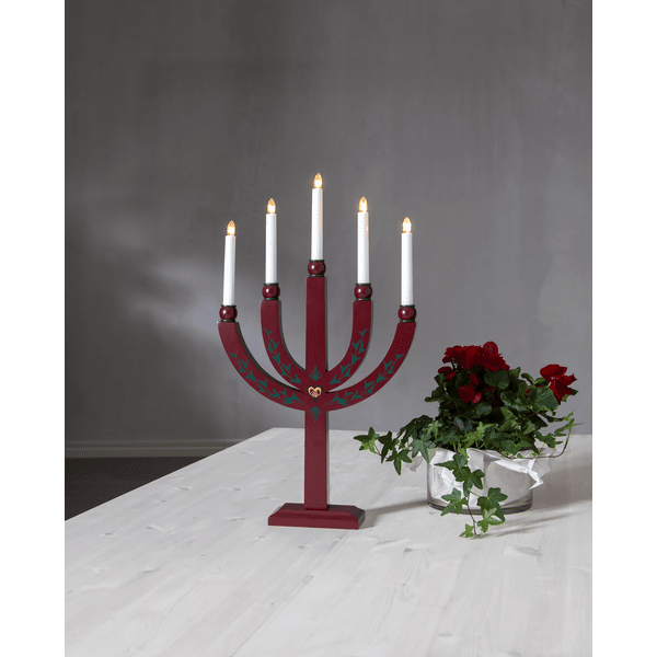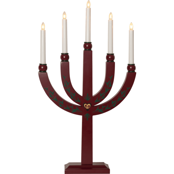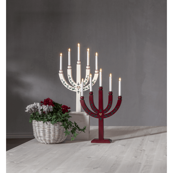 Traditioneller Kerzenständer aus Holz mit feinen Details. Der Adventskerzenständer verfügt über 5 Lichtquellen, die dem Kerzenständer eine gemütliche Beleuchtung und eine heimelige Weihnachtsstimmung verleihen. Platzieren Sie es im Fenster oder auf einer Flasche. Wird mit 1,8 m langem weißem Kabel, Netzschalter und Stecker geliefert. 5 austauschbare E20-Glühbirnen im Lieferumfang enthalten (55 V).