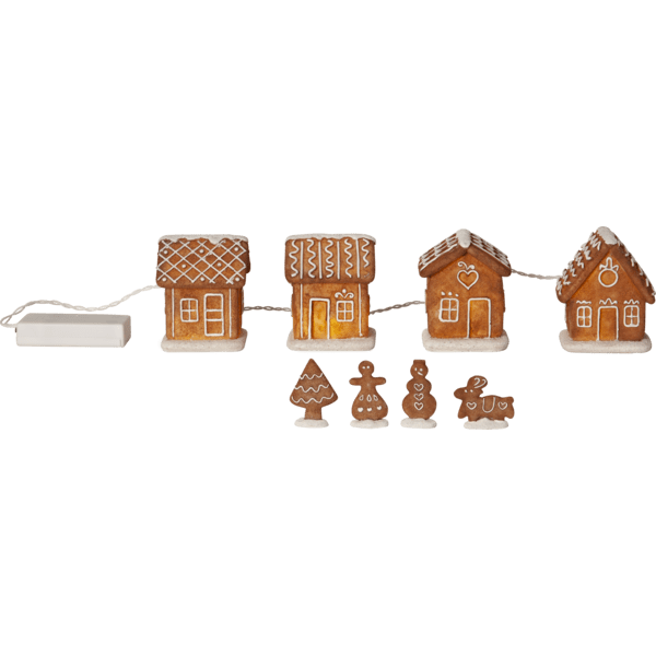 8-teiliges Dekorationsset, perfekt für die Weihnachtszeit. Das Set besteht aus 4 kleinen Lebkuchenhäusern mit 4 Lebkuchenfiguren. Die Häuser leuchten schön, sobald das Produkt eingeschaltet ist. Platzieren Sie sie auf einem Tisch oder Regal für eine stimmungsvolle Weihnachtsatmosphäre. Betrieb mit 2 AA-Batterien (nicht im Lieferumfang enthalten). Ein 25 cm langes Zusatzkabel verbindet das Batteriefach mit dem ersten Lebkuchenhaus. Brenndauer ca.: 75 Stunden.