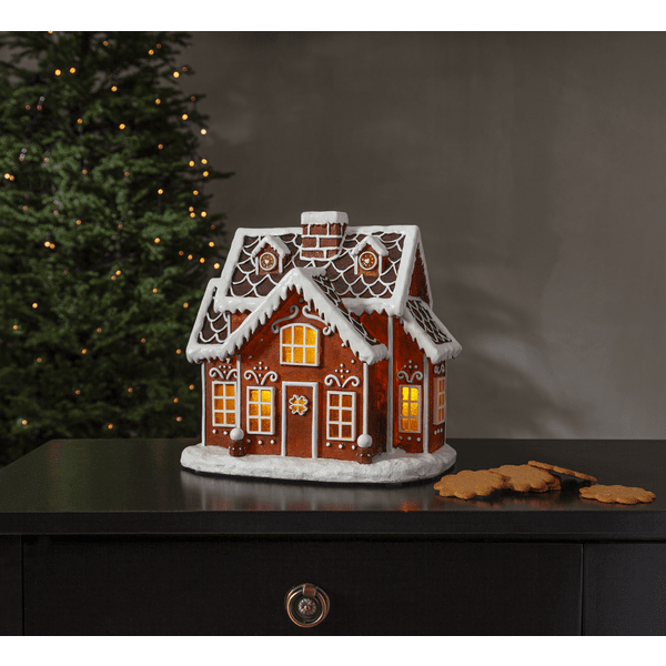 Fantastische Weihnachtsdekoration in Form eines Lebkuchenhauses. Eingeschaltet erstrahlt sie mit warmweißem Licht im Fenster. Sowohl mit Netzkabel und Transformator als auch mit Batteriebetrieb und Timer (6 Stunden an, 18 Stunden aus, Wiederholung) erhältlich. Eine stimmungsvolle Weihnachtsdekoration, die jedem Anlass das gewisse Etwas verleiht. Verschönern Sie das Kinderzimmer oder stellen Sie sie auf ein Sideboard, damit die ganze Familie sie bewundern kann. Für den Batteriebetrieb werden 3 AA-Batterien benötigt (nicht im Lieferumfang enthalten).