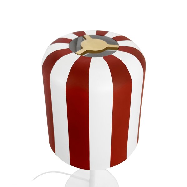 Inspirerad av färgglada karuseller, pariserhjul, luftballonger och sötsaker skapade den danska designern Gry Fager en lampserie som sprider glädje. GenomMehr lesenInspirerad av färgglada karuseller, pariserhjul, luftballonger och sötsaker skapade den danska designern Gry Fager en lampserie som sprider glädje. Genom att ta igenkännbara mönster och sätta dem i en ny kontext ville hon skapa en lampa som får människor att le och ger en unik visuell upplevelse. Resultatet blev en serie med bordslampor och pendellampor tillgängliga i tre färger – rött, gult och grått. Tillverkade i vit metall med färgade ränder, kompletteras lamporna med en vit textilsladd och en elegant mässingsdetalj på toppen. Ljuskälla ingår ej.