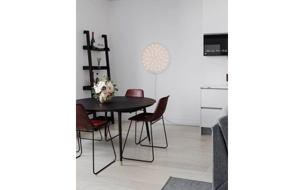 Die Hayden-Wandleuchte hat einen Durchmesser von 70 cm und eine Tiefe von 5 cm und nimmt somit ordentlich Platz ein. die Wand. Durch die vielen kleinen LED-Leuchtmittel wird das Licht durch Material und Form der Leuchte greifbar und interessant zugleich. Die Lampe ist mit einem Dimmer dimmbar. das Kabel. Eine Kabellänge von ca. 200 cm ermöglicht es, die Lampe auch etwas weiter entfernt von der Steckdose anzubringen.