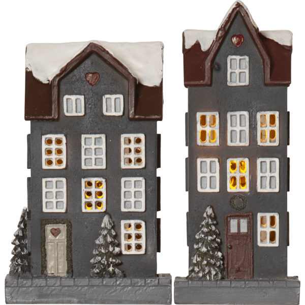Ein Set aus zwei Häusern, 13 cm und 14,5 cm hoch. Beide Häuser strahlen durch die Fenster einen wunderschönen warmen gelben Schein aus. Dekorieren Sie damit ein Regal oder stellen Sie sie auf eine Flasche. Perfekt für die gesamte dunkle Jahreszeit und als stimmungsvolle Dekoration zur Advents- und Weihnachtszeit. Ausgestattet mit Timerfunktion, 6 Stunden an, 18 Stunden aus, wiederholend. Stromversorgung über 4 AAA-Batterien, nicht im Lieferumfang enthalten.