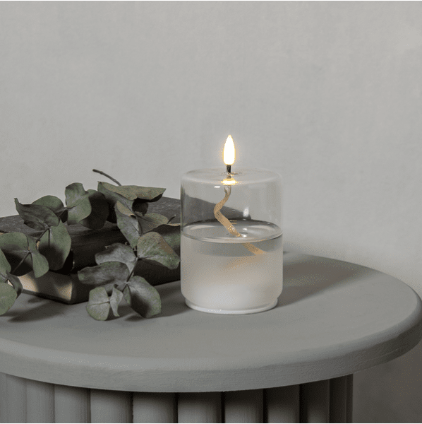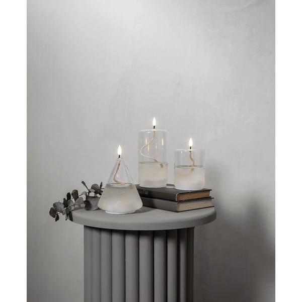 Flamme Float ist eine Kerze mit einem Glasbehälter mit transparentem Wachs im Inneren, der das Gefühl einer Ölkerze vermittelt, bei der der Docht schwimmt. Das transparente Wachs kann Luftblasen enthalten, was für ein noch natürlicheres Aussehen sorgt. Diese batteriebetriebene Kerze ist sowohl allein als auch in der Gruppe mit anderen Kerzen aus der Flamme Float-Serie eine schöne Dekoration. Es verfügt über eine Timerfunktion und wenn der Schalter eingeschaltet ist, leuchtet das Licht im Timermodus 6 Stunden lang und 18 Stunden lang nicht, in einer Wiederholungsphase, mit einem schönen, realistischen warmweißen Licht. Die Stromversorgung erfolgt über 3 AAA-Batterien, diese sind nicht im Lieferumfang enthalten. Brenndauer ca. 200 Stunden.