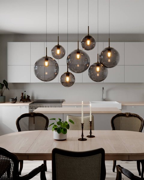 Entdecken Sie die Deckenleuchte Laura, eine beeindruckende Kombination aus modernem Design und klassischer Eleganz. Diese Lampe aus mattschwarzem Metall mit stilvollen Messingdetails verströmt einen zeitlosen Charme. Sie ist mit sieben hellgrauen Glaskuppeln in unterschiedlichen Größen ausgestattet, die sich ganz einfach zusammenstecken lassen und so für eine harmonische Lichtwirkung sorgen. Die schwarzen, verstellbaren Textilkabel erfüllen nicht nur eine praktische Funktion, sondern tragen auch zur anspruchsvollen Ästhetik der Lampe bei. Laura eignet sich besonders für größere Räume, wo sie Platz einnimmt und als zentrales Dekorationsstück fungiert. Sein exklusives Aussehen und seine robuste Konstruktion machen es zu einer ausgezeichneten Wahl für alle, die Wert auf Stil und Funktionalität legen. Mit Laura erhalten Sie nicht nur eine Lichtquelle, sondern auch ein Design-Statement, das die Atmosphäre des gesamten Raumes aufwertet. Diese Deckenleuchte passt sowohl zu modernen als auch zu traditionellen Einrichtungsstilen und bietet eine perfekte Balance zwischen Form und Funktion, was sie zu einer unverzichtbaren Ergänzung für Ihr Zuhause macht. Die Länge der Deckenhalterung beträgt 86 cm. Lichtquellen sind nicht im Lieferumfang enthalten.