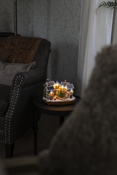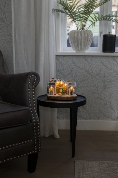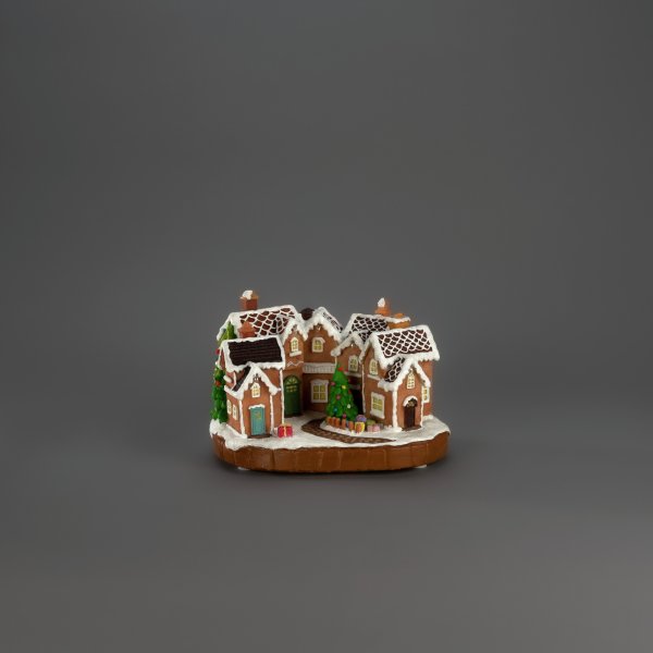 Schaffen Sie mit diesem detailreichen Lebkuchendorf aus Polyresin eine gemütliche und verspielte Weihnachtsatmosphäre. Die schneebedeckten Dächer, die bunten Türen und der geschmückte Weihnachtsbaum in der Mitte erzeugen ein märchenhaftes Weihnachtsflair. Warmweiße LED-Lichter beleuchten die Häuser und sorgen für ein behagliches Ambiente. Das Lebkuchendorf wird mit 3 AA-Batterien (nicht im Lieferumfang enthalten) betrieben und kann auch mit dem beiliegenden USB-Kabel an ein Stromnetz angeschlossen werden (Netzteil nicht im Lieferumfang enthalten). Perfekt als stimmungsvolle Dekoration für Ihr Zuhause in der Weihnachtszeit.