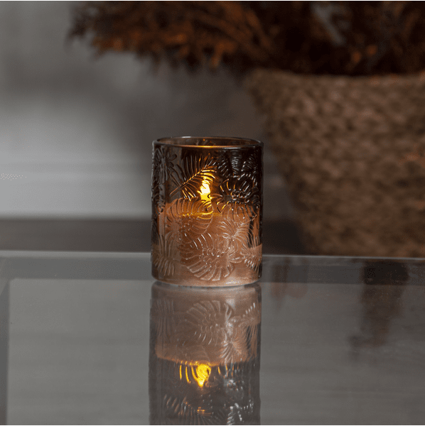 Flamme Leaf ist eine batteriebetriebene Glaslaterne aus braunem Glas mit einem Blattmuster im Relief um eine weiße Wachskerze. Diese batteriebetriebeneMehr lesenFlamme Leaf ist eine batteriebetriebene Glaslaterne aus braunem Glas mit einem Blattmuster im Relief um eine weiße Wachskerze. Diese batteriebetriebene Kerze ist sowohl allein als auch in der Gruppe mit anderen Kerzen der Flamme-Serie eine schöne Dekoration. Es verfügt über eine Timerfunktion und wenn der Schalter eingeschaltet ist, leuchtet das Licht im Timermodus 6 Stunden lang, 18 Stunden lang aus (in Wiederholung), mit einer schönen realistischen Flamme in warmweißem Licht. Die Stromversorgung erfolgt über 2 AA-Batterien, diese sind nicht im Lieferumfang enthalten. Brenndauer ca. 200 Stunden.