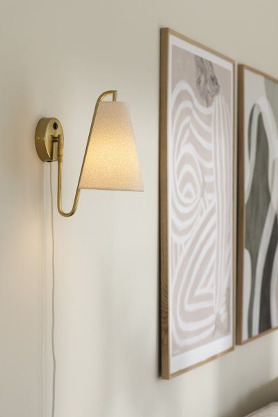 Lou ist eine funktionale und dekorative Wandleuchte mit beweglichem Gelenk und einem Lampenschirm aus Bouclé-Gewebe. Das Metall in gebürsteter MessingoptikMehr lesenLou ist eine funktionale und dekorative Wandleuchte mit beweglichem Gelenk und einem Lampenschirm aus Bouclé-Gewebe. Das Metall in gebürsteter Messingoptik und der weiße, strukturierte Stoff verleihen ihr eine sanfte und moderne Ausstrahlung. Der Ein-/Ausschalter befindet sich für eine einfache Bedienung an der Wandhalterung. Lou ist eine vielseitige Leuchte, die sich in viele verschiedene Umgebungen einfügt und bei Bedarf auch fest installiert werden kann. Im Lieferumfang enthalten sind ein 2 m langes, weißes Textilkabel und ein Netzstecker. Leuchtmittel ist nicht enthalten.