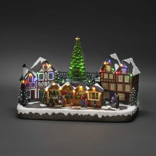 Schaffen Sie mit diesem mechanischen Weihnachtsmarkt ein lebendiges Winterwunderland in Ihrem Zuhause! Mit 28 warmweißen LED-Lichtern, schneebedeckten Häusern, bunten Marktständen und einem stattlichen Weihnachtsbaum in der Mitte verbreitet es sowohl Licht als auch Musik. Eine stimmungsvolle Dekoration, die an klassischen Weihnachtszauber erinnert! Stromversorgung über 3 AA-Batterien (1,5 V – nicht im Lieferumfang enthalten). Transformator mit 1,8 m langem schwarzem Kabel und Stecker im Lieferumfang enthalten. Integrierte LED-Beleuchtung.