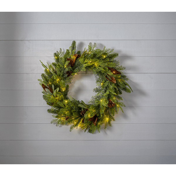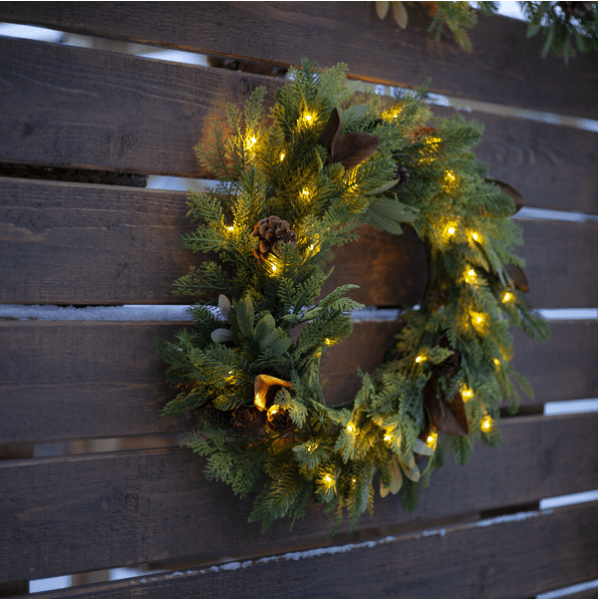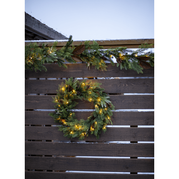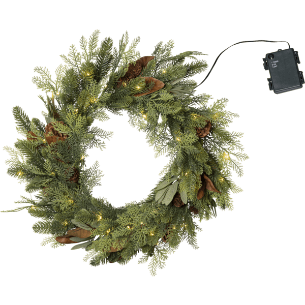 Der Mixi-Kranz besteht aus einer Mischung aus Blättern und Nadeln aus PE-Material. 30 warmweiße LEDs in Tropfenform sorgen für ein angenehmes, warmes Licht. Der Kranz eignet sich sowohl für den Innen- als auch für den Außenbereich und ist eine wunderschöne Dekoration für Türen oder Wände. Er verfügt über einen Timer (6 Stunden an, 18 Stunden aus, Wiederholung). Ein 30 cm langes Kabel führt zum Batteriefach. Der Kranz wird mit 3 AA-Batterien betrieben (nicht im Lieferumfang enthalten). Die Leuchtdauer beträgt ca. 150 Stunden.