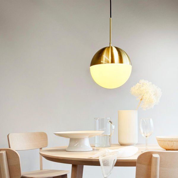 Die Pendelleuchte Nova ist ein modernes Beispiel dänischen Designs, das zeitlose Eleganz mit Funktionalität verbindet. Die runde Leuchte mit ihrerMehr lesenDie Pendelleuchte Nova ist ein modernes Beispiel dänischen Designs, das zeitlose Eleganz mit Funktionalität verbindet. Die runde Leuchte mit ihrer kuppelförmigen Oberseite aus Messing und der Unterseite aus Opalglas sorgt für ein sanftes und angenehmes Licht. Die Kombination aus Glas und Metall verleiht ihr eine exklusive Ausstrahlung, die perfekt in skandinavische Wohnungen passt. Mit einem Durchmesser von 25 cm eignet sie sich ideal über dem Esstisch, in der Küche oder im Flur. Dank des drei Meter langen Kabels lässt sich die Höhe bequem verstellen. Leuchtmittel nicht im Lieferumfang enthalten.