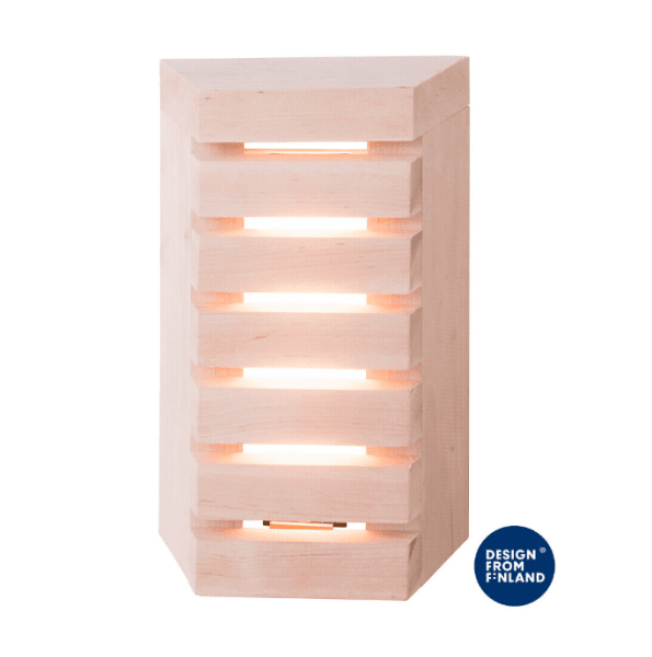 Saunaled V (vertikal) ist eine elegante Saunaleuchte mit fest installierter LED. Der Holzarm der Leuchte wird in Finnland aus hochwertiger,Mehr lesenSaunaled V (vertikal) ist eine elegante Saunaleuchte mit fest installierter LED. Der Holzarm der Leuchte wird in Finnland aus hochwertiger, heimischer Leimholzerle gefertigt. Die Leuchte ist dimmbar, sodass Sie die Lichtmenge je nach Situation anpassen können. Die staub- und wasserdichte Leuchte kann auf der Oberfläche montiert oder in die Wand eingelassen werden. Wir empfehlen, die Holzteile vor Gebrauch mit Holzschutzmittel zu behandeln. Sie können die Fäden auch einzeln lackieren, so; dass sie zum Interieur Ihrer Sauna passen. Montagehöhe max. 1 m.