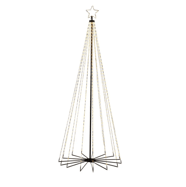 Dieser Weihnachtsbaum aus Metall mit Sternen und integrierter LED-Beleuchtung ist eine stilvolle und moderne Interpretation des klassischen Weihnachtsbaums. Mit seinen 665 LED-Leuchten verbreitet er einen stimmungsvollen und warmen gelben Schein, der im Außenbereich für eine einladende Atmosphäre sorgt. Mit der Schutzart IP44 ist es perfekt für den Außenbereich geeignet und wetterfest. Das elegante Design und der leuchtende Stern auf der Spitze machen es zu einer fantastischen Dekoration für den Garten oder die Veranda während der Weihnachtszeit. Darüber hinaus verfügt die Leuchte über einen integrierten Dimmer, sodass Sie die Helligkeit in mehreren Stufen regulieren können. Lieferung inkl. 10m Anschlusskabel und Trafo.
