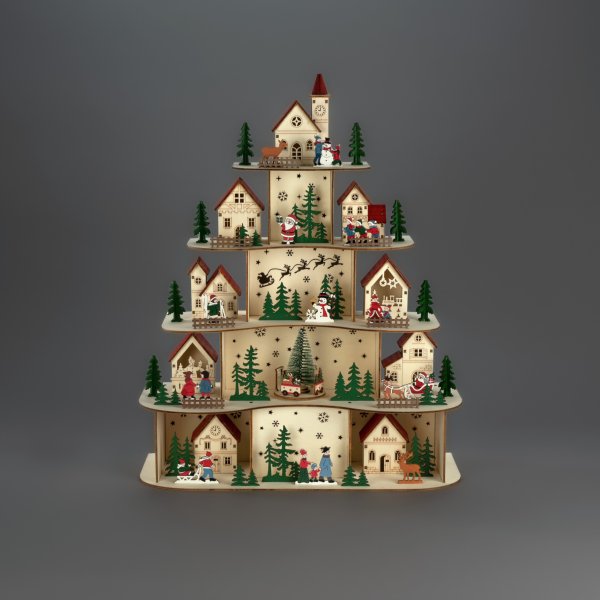 Schaffen Sie mit diesem dekorativen Weihnachtsdorf aus Holz eine warme und stimmungsvolle Weihnachtsatmosphäre. Das detailreiche Design erstreckt sich über mehrere Etagen und zeigt kleine Häuser, Tannenbäume und winterliche Motive, die zusammen eine bezaubernde Weihnachtsgeschichte erzählen. Die integrierten LED-Lichter beleuchten die Szenerie und erzeugen ein sanftes, einladendes Licht. Eine perfekte Dekoration für Tische, Fenster oder Sideboards während der Advents- und Weihnachtszeit. Das Weihnachtsdorf wird mit 3 AA-Batterien (nicht im Lieferumfang enthalten) betrieben und verfügt über eine Timer-Funktion (6 Stunden an, 18 Stunden aus, Wiederholung), was es sowohl praktisch als auch energieeffizient macht. Ein USB-Kabel für alle, die ein Netzkabel bevorzugen, ist ebenfalls enthalten (Netzteil nicht im Lieferumfang enthalten).